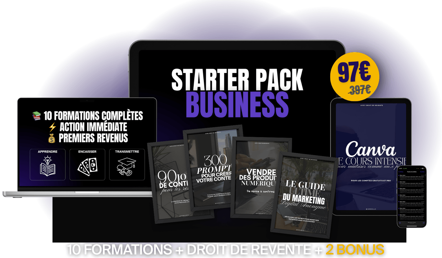 J’ai décidé de condenser l’essentiel de ces 14 années d’expérience dans un seul pack, pensé pour permettre à toute personne sérieuse et motivée de se lancer même avec 97€
